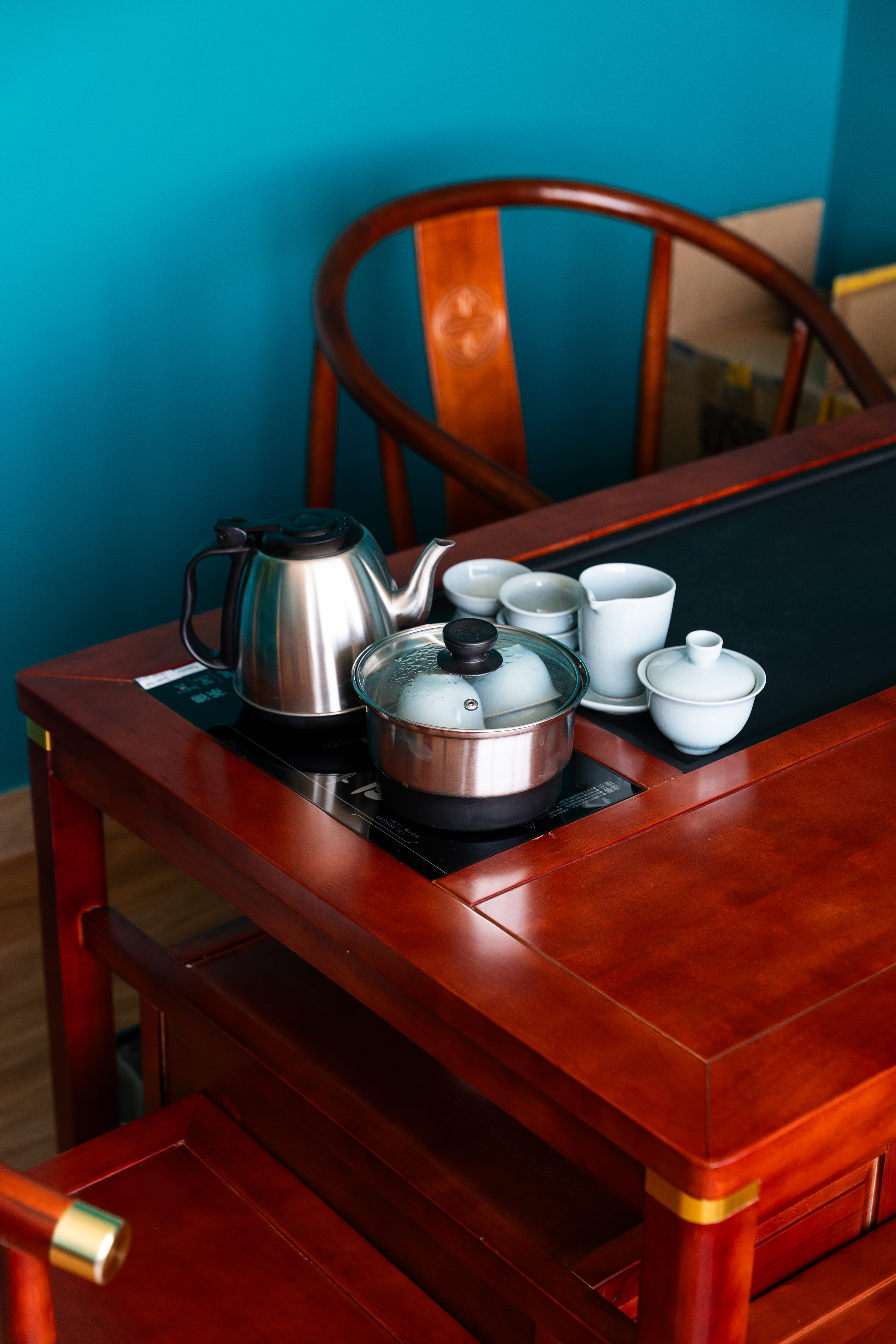 Open workstations are softened by planters, while enclosed rooms provide space for meetings and concentration. Teal accents introduce a contemporary edge within a restrained palette.